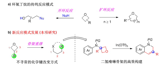 最近开元集团KY开元集团官网新引进的青年教师黄海博士与孙建伟教授在Angew. Chem. Int. Ed.上共同发表题为“Unusual Skeletal Reorganization of Oxetanes for the Synthesis of 1,2-Dihydroquinolines”的研究论文。骨架重排是有机化学中重要且有趣的反应模式,它能够构建出很多复杂但实用价值很高的有机分子骨架。因此,探索特殊官能团骨架重排反应,揭示其反应规律是有机合成中重要的研究方向。本论文实现了一种关于环氧丁烷特殊骨架重排反应,这是继环氧丁烷传统开环和扩环反应方式上的一次全新的反应模式突破。通过本骨架重排策略,能够高效快速的构建二氢喹啉骨架。后期应用显示,目标分子具有很高的合成价值,是一类不可或缺的骨架结构。