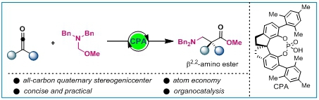 孙江涛团队发展了一种以烯酮和N,O-缩醛为原料,在手性磷酸催化下实现了烯酮的不对称胺甲基化,从而简洁、高效、绿色合成光学纯的β2,2-氨基酸的新方法。