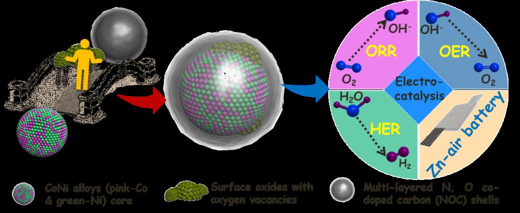 氧气还原、氧气析出以及氢气析出等小分子电催化反应是锌空气电池、锂空气电池、燃料电池以及电化学分解水制氢等能量存储与转换技术的核心反应,然而它们均是动力学慢反应,都需要使用催化剂来加速它们的反应,从而提高存储和转换效率。在单一催化剂上实现多功能电催化一直是该领域研究的热点和重点,这对于降低上述能量存储与转换器件结构的复杂性、大幅度提高性能,促进它们的产业化都具有重要意义。银凤翔-陈标华课题组的何小波副研究员利用CoNi-双金属有机骨架材料为前驱体,开发了一种“表面轻微氧化的CoNi 合金@氮/氧共掺杂碳”的多功能催化剂。这种多功能催化剂拥有媲美于贵金属催化剂的氧气还原、氧气析出以及氢气析出的高效电催化性能。更为突出的是,这种电催化剂使得锌空气电池拥有98.6%的理论比容量和74.8%的理论能量密度,并且超过100小时运行后锌空气电池的性能几乎没有衰减。深入的构-效关系研究发现,该催化剂中CoNi合金纳米颗粒表面存在的少量氧化层起到了关键作用。这种关键作用主要体现在以下两个方面:(一)少量氧化层“富含”氧空位,氧空位促进了从CoNi合金纳米颗粒(核心)到氮/氧共掺杂碳(外壳)的电子转移,从而优化了在电催化过程中起直接催化作用的氮/氧共掺杂碳中活性位的电子结构及其对反应物种的吸脱附能力,最终使得CoNi合金纳米颗粒(核心)和氮/氧共掺杂碳(外壳)在多功能电催化过程中能够分别“间接”与“直接”地贡献各自的作用;(二)“富含”氧空位的少量氧化层还增强了催化剂的整体导电性,从而促进了催化剂、电解液与气态反应物(产物)之间的三相界面电荷转移,最终有利于加速多功能电催化反应过程。