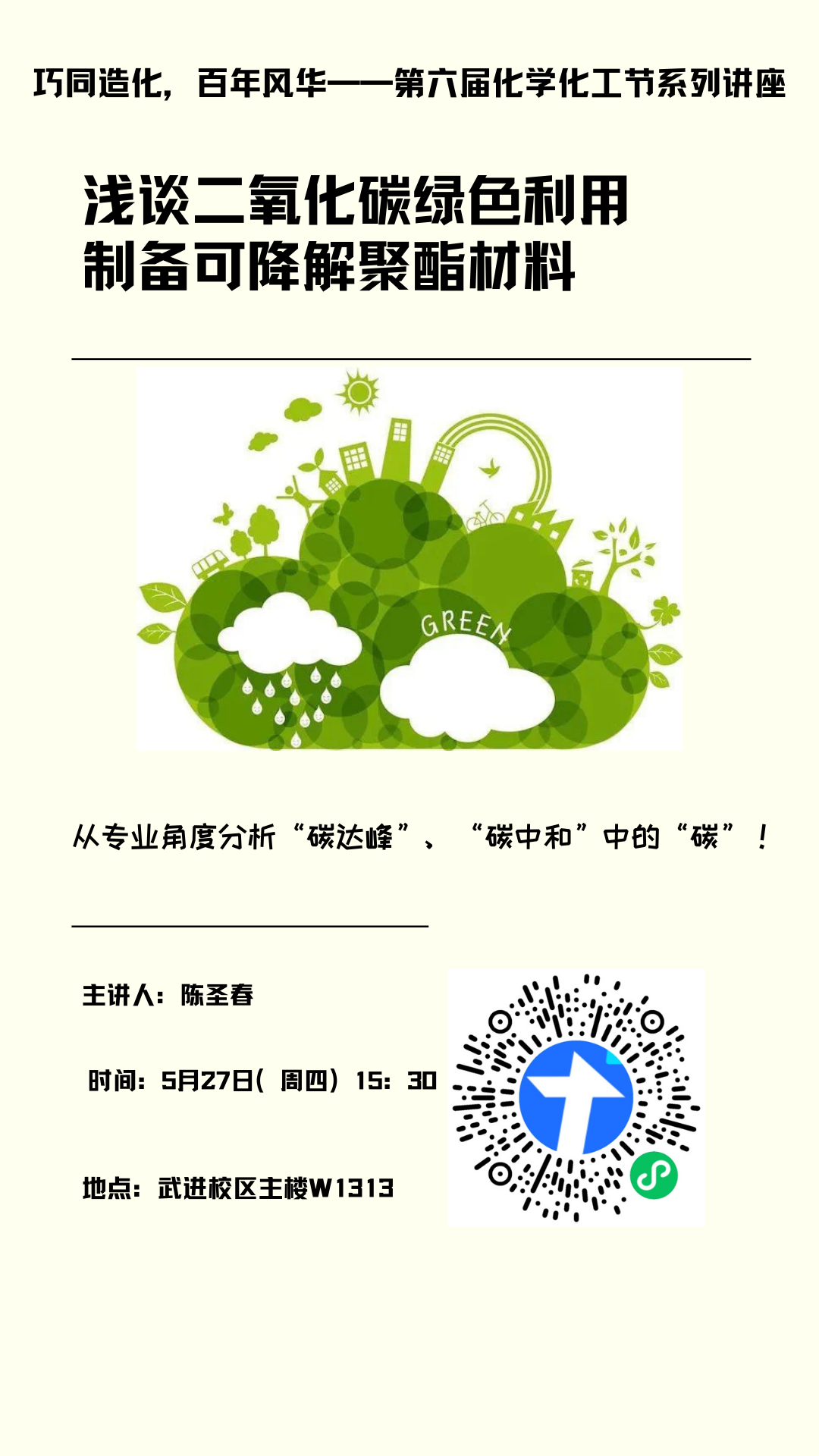 【讲座】5月27日科普讲座《浅谈二氧化碳绿色利用制备可降解聚酯材料》---陈圣春