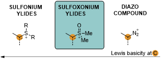 锍叶立德作为两性离子化合物,一般需要在叶立德Cα-位引入吸电子基来稳定其存在。此外,根据硫原子氧化态的不同,可以分为sulfonium ylide(正锍叶立德)与sulfoxonium ylide(氧化锍叶立德)两大类。电负性氧原子的引入,不仅使得氧化锍叶立德的叶立德碳Lewis碱性降低,而且具Lewis碱性的氧原子或副产物DMSO容易与手性催化剂结合,从而可能对反应过程中的手性诱导产生干扰。但与正锍叶立德以及类似的重氮化合物相比,氧化锍叶立德具有良好的稳定性,之前报道的绝大多数文献都将其作为重氮化合物的替代物经金属卡宾中间体应用于有机合成。因此,发展基于锍叶立德不对称催化研究具有重要意义。