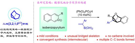 近日,黄海教授与孙建伟教授课题组在Angew. Chem. Int. Ed.上发表题为“A Mild Intermolecular Synthesis ofCyclopropane-Incorporated Tricyclic Skeleton: Unusual Reactivity of Isobenzopyryliums”的研究论文。复杂的结构骨架,特别是带有张力小环的骨架结构是天然产物较为多见的母体结构,但是由于结构的复杂性和不稳定性,这一类骨架的构建一直以来是具有挑战性的工作。例如,三环[3,2,1,02,7]辛烷就是这样一类复杂又带有张力小环的骨架结构,以往的构建策略都需要涉及金属卡宾、高温等苛刻反应条件来克服动力学或热力学不利的问题。本论文实现了一种在普通酸催化下的苯并异吡喃盐与烯基硼酸连续[4+2]环加成/关环反应,成功构建了氧杂三环[3,2,1,02,7]辛烷骨架结构。该类结构预计在药物分子中具有潜在的应用价值。同时,后期合成应用显示,目标分子具有很高的合成价值,是一类不可或缺的骨架结构。