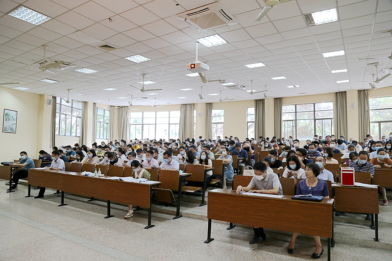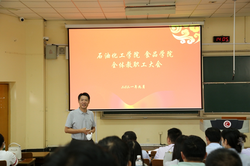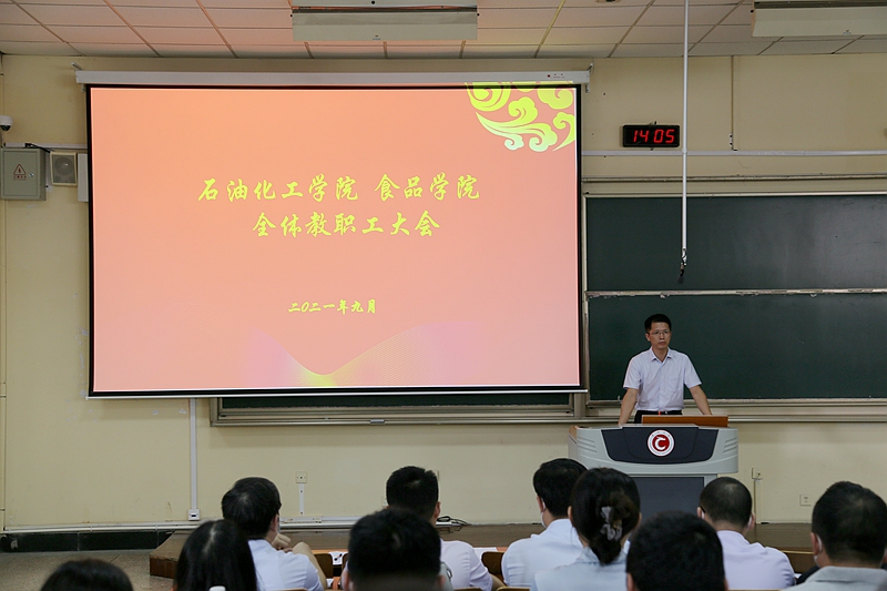 2021年9月16日下午,KY开元集团官网 食品学院在武进校区第八阶梯教室召开全院教职工大会,全体教职工参加了会议,党委书记吴荷平主持会议。