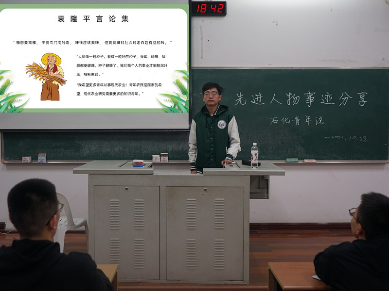 分享会上,许涵侨简要介绍“石化青年说”的基本内涵后,主讲人汤越详细地讲述袁隆平同志的生平和贡献,着重分享袁隆平先生的精彩言论集,并以此呼吁广大青年传承袁隆平先生的伟人精神。