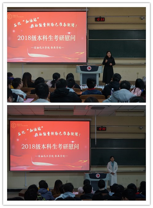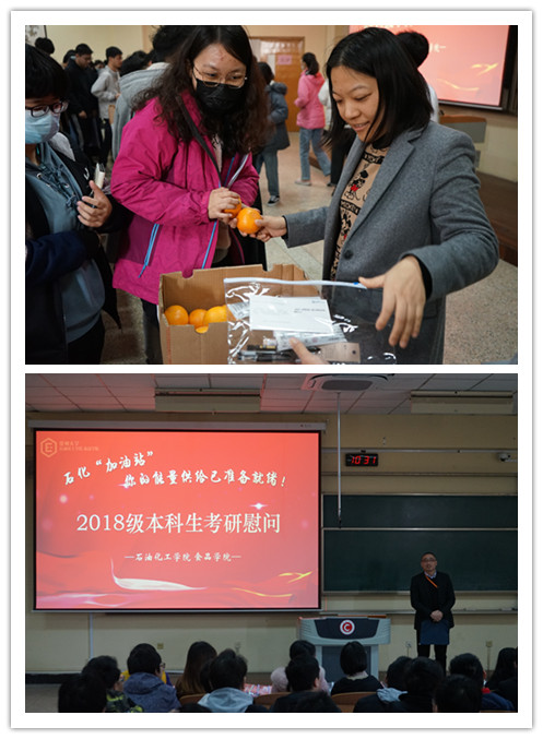 管春英结合自身求学经历激励考生们在最后冲刺阶段静心聚力,以必胜的信念迎接挑战;钟璟悉心询问了各位考研学子的复习进度和心理状态,并给予针对性的意见宣慧勉励大家‘研’为定,明年一定研一,踏上更高的平台,迎接新的挑战;刘文杰对考研学子的执着追梦精神表示肯定,并指出考研是提高学业水平的重要途径,对未来发展起重要作用最后,学院还为考研学子们发放石化“加油卡”、石化“加油包”、石化“加油橙”,祝愿所有考研学子心想事成,马到成功!