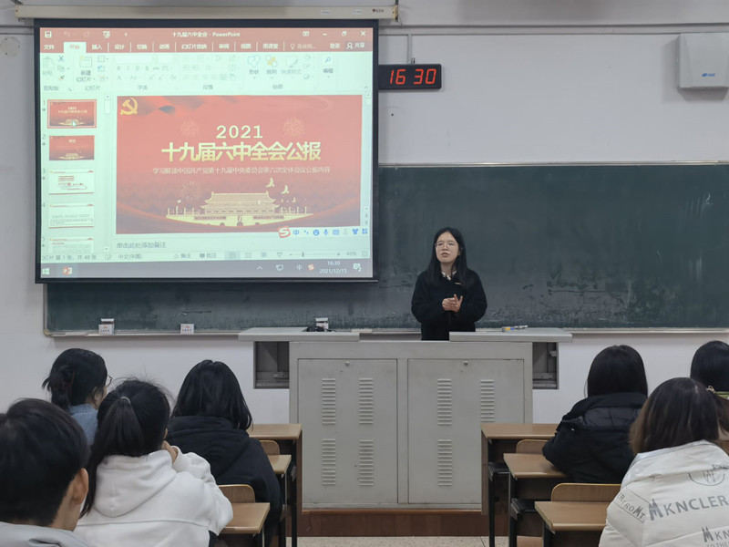 为深入学习贯彻党的十九届六中全会精神、思想精髓和重大意义,引领和带动学院青年坚定不移听党话、跟党走,关心青年思想状况,引领青年思想认识,落实联青工作要求,12月15日,院学生党支部于w1210开展党课活动,支部书记孙潘以《党的十九届六中全会精神》为题做专题党课报告,学生党员及入党积极分子参加活动。