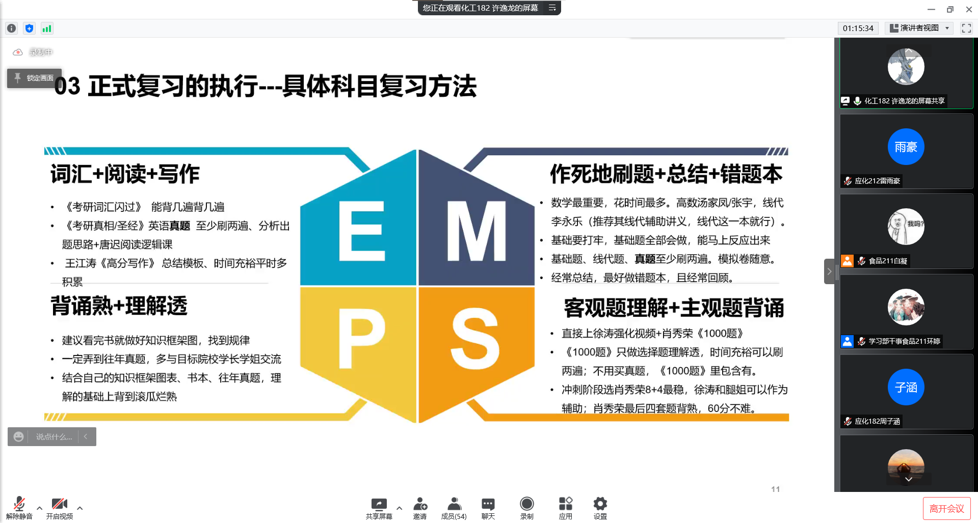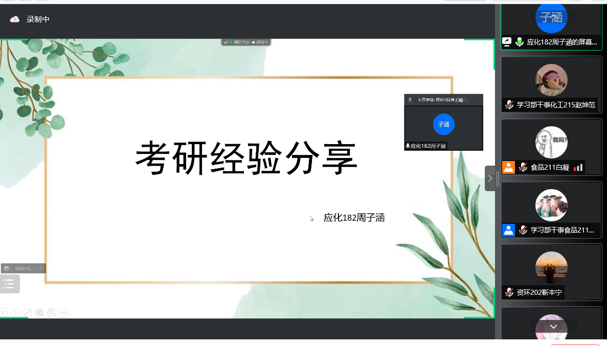 为营造良好学风,鼓励学生挖掘自身潜能、把握深造机会,开元集团于2022年4月15日、22日、29日在腾讯会议开展三场“研”路有你主题榜样宣讲活动,本次宣讲由成功上岸南京大学、厦门大学、大连理工大学、中国石油大学和华东理工大学等14所高校的学生主讲。