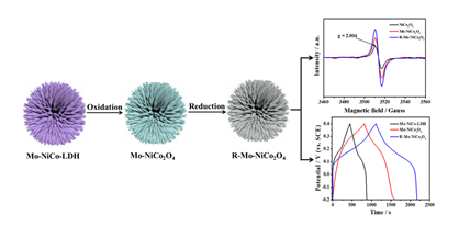 近年来,过渡金属氧化物以其可变的氧化价态,成本低廉,易于制备而引起广泛关注。此外,鉴于过渡金属氧化物的理论比电容较高且电活性较好,故而在储能领域具有重要地位。在本工作中,课题组提出了一种双缺陷工艺构建富含氧空位和Mo掺杂的NiCo2O4(R-Mo-NiCo2O4)。通过NaBH4还原在NiCo2O4晶格中产生氧空位缺陷,在材料中产生更多的载流子,使更多活性物质参与电化学氧化还原反应过程。此外,氧空位和Mo掺杂的协同作用不仅提高了材料的导电性,而且丰富了氧化还原动力学。将通过氧空位和Mo掺杂双缺陷工艺制备得到的R-Mo-NiCo2O4用做超级电容器电极,在电流密度1 A g−1下比容量高达285.8 mAh g−1,且具有较好的倍率性能及循环稳定性。该电极材料优异的性能可归因于R-Mo-NiCo2O4较大的比表面积可增加其与电解质的接触面积,实现电解质充分扩散的同时缩短了电荷转移的扩散路径;Mo元素的引入促进了电荷转移,提高了R-Mo-NiCo2O4的导电性,同时Mo元素的引入有助于形成氧空位缺陷,促进离子在电极中的扩散;经NaBH4还原后,氧空位缺陷的数量可进一步增加,提升了该电极材料的电化学性能。该成果于近日发表于化学领域著名期刊Chemical Communications (2022, 58, 5120–5123)。