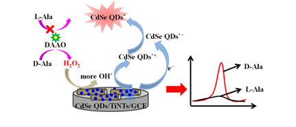 氨基酸(AA)是生物体内最重要的分子之一,绝大多数AA具有对映异构体,不同的AA对映体往往表现出不同的生理特性,一种AA对映体可能对疾病治疗有益,而另一种对映体可能毫无用处甚至具有副作用。因此对AA对映体进行手性识别具有重要的研究意义。在本工作中,课题组制备了3-巯基丙酸功能化的硒化镉量子点(MPA-CdSe QDs),使其与氨基化的TiO2纳米管(NH2-TiNTs)发生酰胺化反应。由于CdSe QDs与TiNTs之间的协同效应,得到的CdSe QDs/TiNTs获得了增强的ECL性能。利用D-氨基酸氧化酶(DAAO)可选择性地催化D-AA产生H2O2,采用电化学发光法实现该传感体系在存在DAAO的条件下对多种AA对映体的手性识别。结果表明,该手性传感体系具有较好的对映选择性、稳定性、重现性和普适性。此外,选取D-丙氨酸(D-Ala)作为检测对象,该传感体系对D-Ala具有较好的响应行为,这表明该手性传感器不仅可用于AA对映体的手性识别,还可实现对D-AA的高灵敏检测。该成果于近日发表于分析化学领域国际著名期刊Analytical Chemistry (doi: 10.1021/acs.analchem.2c01383)。