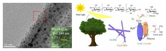 近期李霞章与佐治亚理工学院合作者Chen Yongsheng课题组通过简单的氨蒸发对凹凸棒石(Pal)进行了Cu离子晶格重建,当Cu含量超过6 wt%后,在弱还原物质D-葡萄糖存在下,吸附在重构Pal表面上的多余Cu离子形成氧化亚铜量子点(Cu2O QDs),从而合成了具有强路易斯酸性质的催化剂Cu2O QDs/Cu-Pal,使用了STEM-HAADF以及同步辐射等手段分析了Cu改性凹凸棒石的微结构与配位特征,使用了in situ ATR手段探究了光催化重整反应中间过程。发现随着Cu离子交换容量达到平衡,Cu离子进入了Pal八面体晶格实现Pal重构,且Cu2O QDs等离子共振效应为反应提供了局部热场效应,提高光催化解聚纤维素的效率,在可见光照射下获得了优异的LA选择性。提出如下机理: