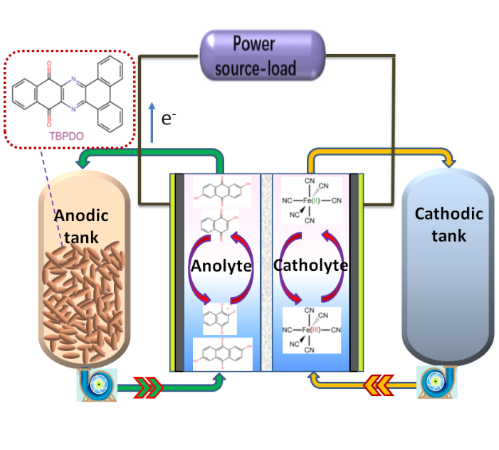 水系有机液流电池(AOFB)可使用具有高理论比容量、资源丰富、易规模化制取和环境友好的氧化还原活性有机分子/聚合物作为储能电解质材料,因而在大规模储能方面应用前景广阔。然而,有机材料在水溶液体系中的较低溶解度和高粘度特性极大地限制了它们的实际应用。开元集团曹剑瑜-许娟团队最近设计开发了一种具有高比容量和快速的氧化还原反应动力学速率的有机固态储能材料——三苯并[a,c,i]吩嗪-10,15-二酮(TBPDO), 通过利用TBPDO与两种水溶性氧化还原穿梭分子(蒽黄酸和指甲花醌)之间能斯特电位驱动的单分子氧化还原靶向(SMRT)反应,有效规避了有机活性电解质材料的溶解度限制,从而显著提高AOFB的能量密度。组建的以TBPDO为阳极容量助推器的氧化还原靶向液流电池(RTFB)表现出显著增强的容积比容量(能量密度)和高的材料利用率(80.2%)。在长期充放电循环期间,每个循环的容量保持率达到99.82%,平均能量效率80.7%。