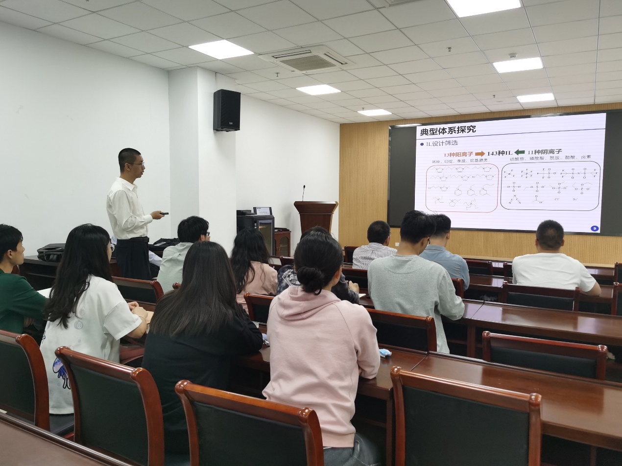 戚律老师作了“过程强化视角下典型化工分离体系探究”的报告,他于2021年4月-2022年3月在上海交通大学罗正鸿教授聚合反应工程实验室访学,报告会上,戚老师介绍了他近几年在化工分离领域基于离子液体所做的多尺度过程强化研究,和大家探讨了化工学科做研究的心得体会。