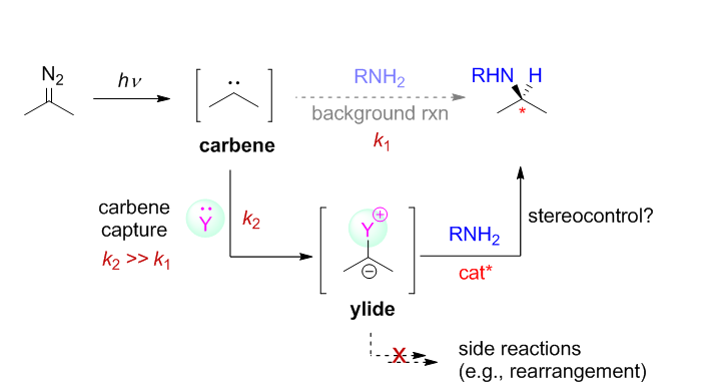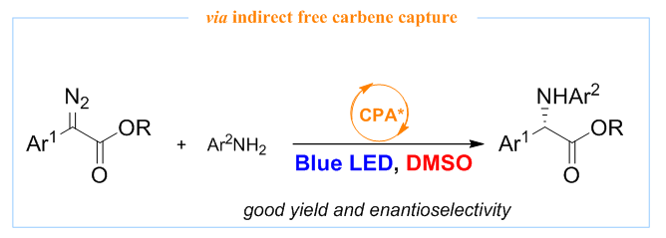 解决方案:如何抑制背景反应以提高有机催化的自由卡宾转移反应的立体选择性,是该研究体系所面临的最重要的科学问题与挑战。基于我们课题组在有机催化的卡宾类似物(硫叶立德)N-H插入反应的研究兴趣,我们首先研究了有机催化的可见光介导条件下的自由卡宾不对称N-H插入反应,通过适当的反应条件优化,我们发现在手性磷酸催化剂存在下,反应最高只能获得具有中等的立体选择性的N-H插入产物。基于此前期研究结果,我们设想能否通过自由卡宾的间接捕获思路,即利用含孤对电子的化合物作为添加剂捕获可见光激发产生的自由卡宾而原位形成新的叶立德中间体,该叶立德中间体需顺利参与手性酸催化的不对称N-H插入反应,从而提高反应的立体选择性(思路见下图)。但此思路中,各步反应速率的匹配性以及添加剂与催化反应体系的兼容性是需要额外考虑的问题。