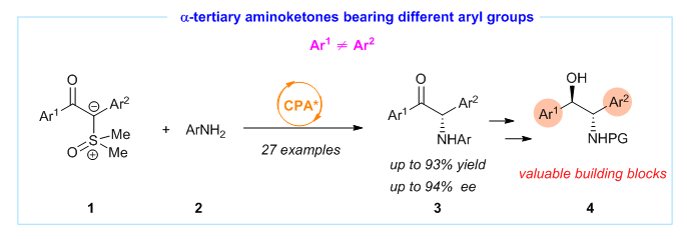 在进行上述卡宾捕获反应时,我们发现之前从未应用于不对称催化反应的两侧含芳基取代的氧化硫叶立德1在手性酸催化下可顺利进行N-H插入反应而获得alpha-氨基酮3,文献中已报道的该类型alpha-氨基酮的有效的不对称催化合成方法很少,究其原因在于手性中心的不稳定。基于此,我们通过手性磷酸催化的氧化硫叶立德的不对称N-H插入反应实现了该类氨基酮的不对称催化合成。我们的方法尤其适合于合成含不同芳基取代基的alpha-氨基酮3,其在药物合成,配体设计,手性辅基设计等领域具有重要的应用价值。