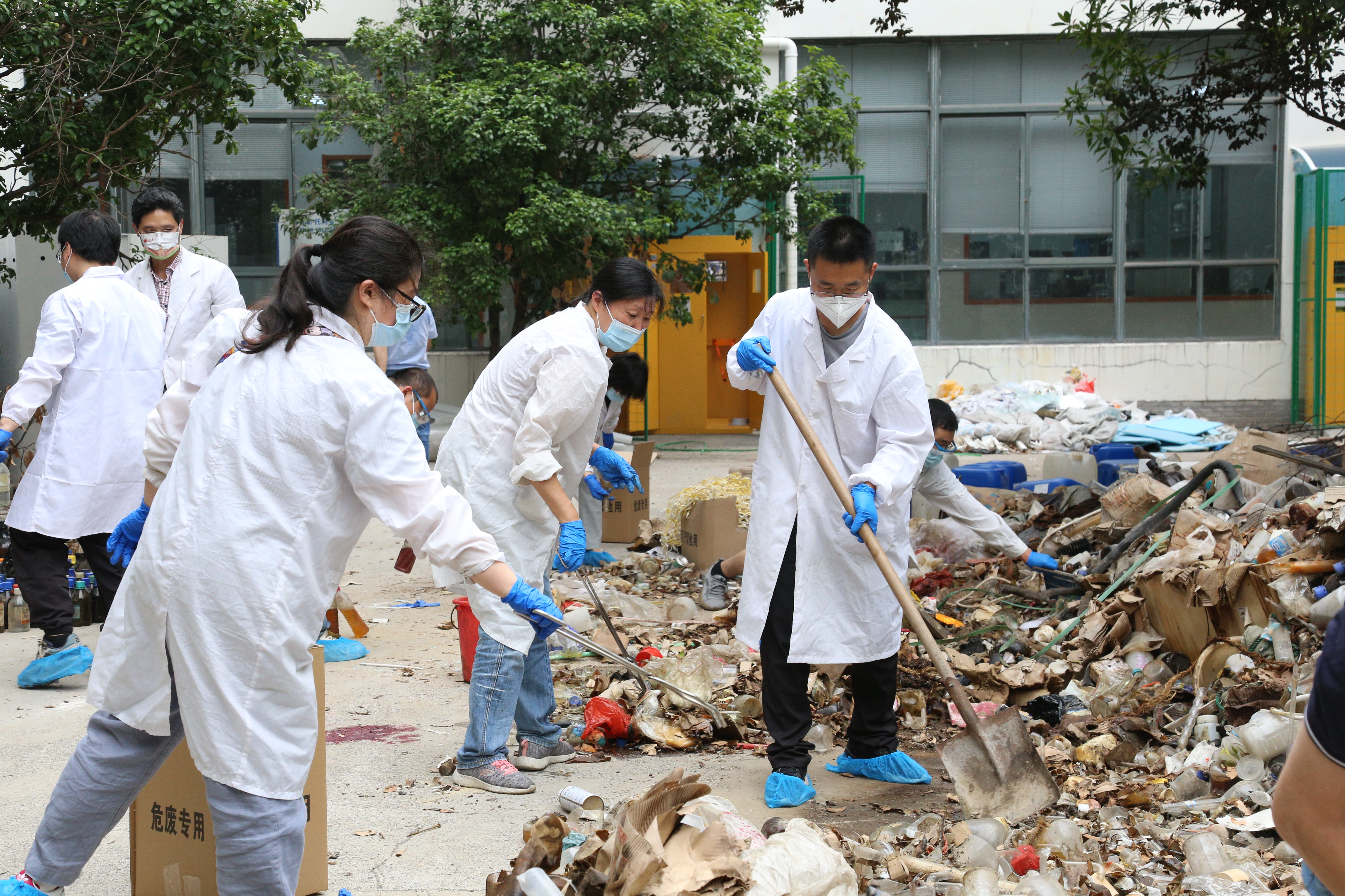 知行楼改造工程过程中清理出的化工废弃物被堆积在小院西南及西北角造成安全隐患,由分工会发起,在全体有化工相关知识的老师中招募志愿者,组织突击队对这些化工废弃物进行专业处理,很多党员主动请缨,加入到了化工垃圾清零行动中。