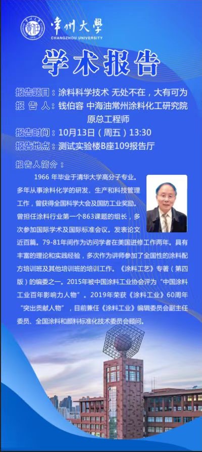 【学术报告】10月13日学术报告——涂料科学技术 无处不在 大有可为