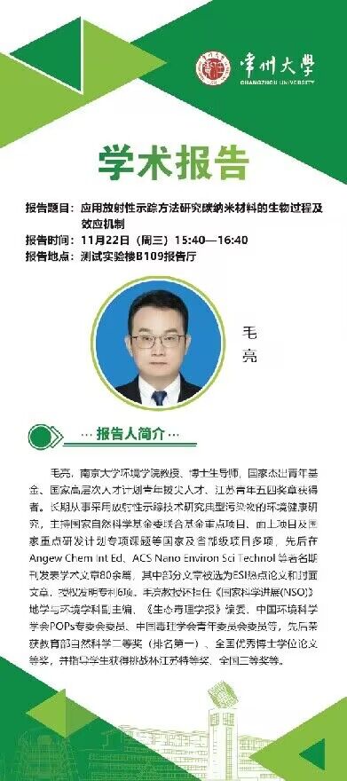 【学术报告】11月22日学术报告——毛亮教授,南京大学环境学院