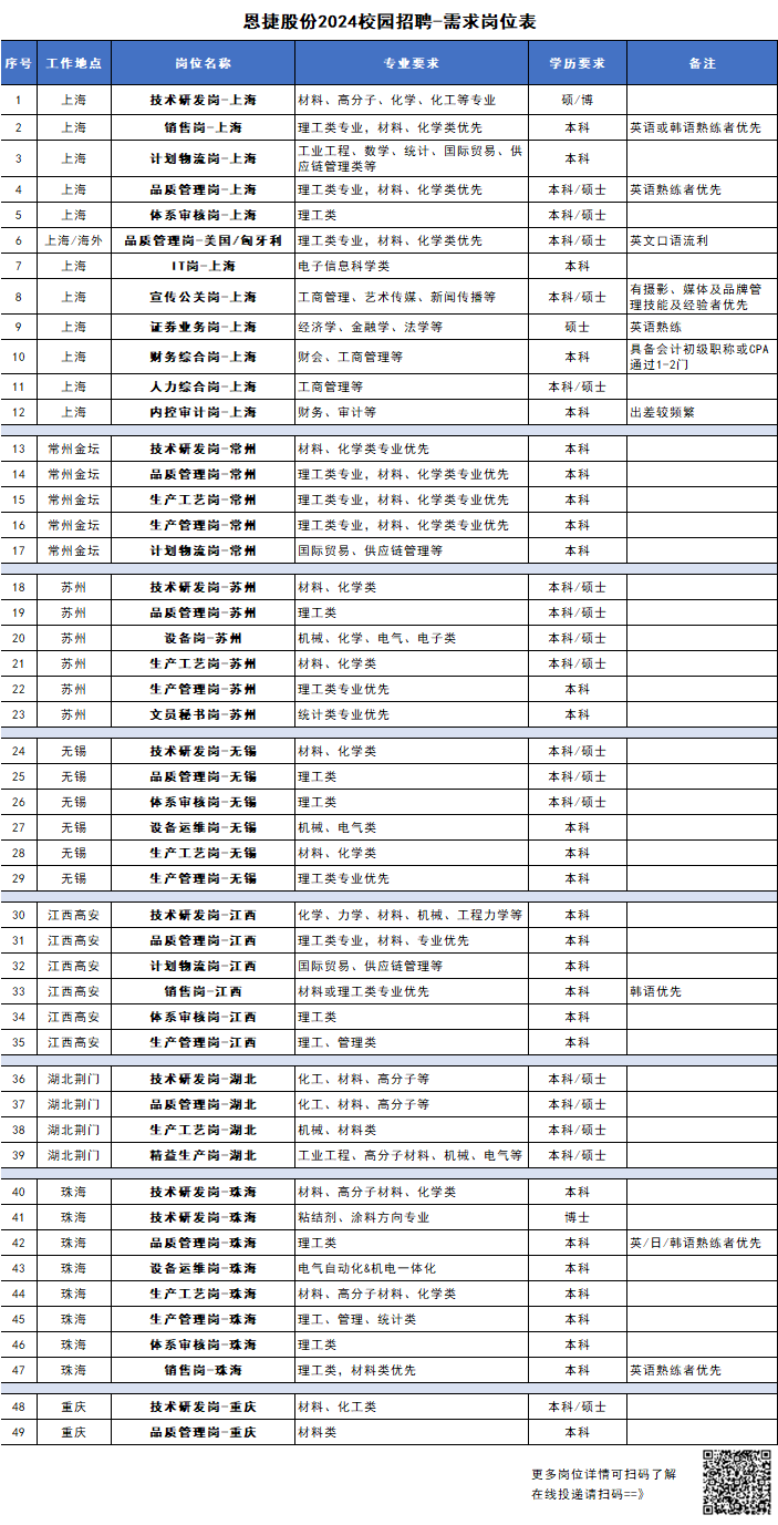上海恩捷新材料科技股份有限公司是全球领先的锂电池隔膜行业龙头企业,22年锂电池隔膜全球市场占有率46%。新能源行业,24年校招岗位200+,工作地点覆盖上海、常州、无锡、苏州、江西、湖北、重庆、珠海、匈牙利、美国等,恩捷希望优先从KY开元集团官网引进化工、能源、化学、材料等专业优秀的本科、硕士、博士人才!简历投递邮箱:recruiter@semcorpglobal.com。