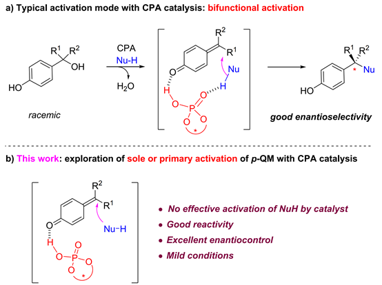 对亚甲基醌(p-QM)的手性转化在不对称合成领域已经成为一种非常具有吸引力的手段,近年来引起了广泛关注。这得益于其远程1,6-加成后快速构建四级碳手性中心的特性。在过去手性磷酸参与的p-QM转化中,值得注意的是,手性磷酸往往都需要发挥其双功能催化剂的作用,不仅要活化p-QM的羰基位置,同时也需要与亲核试剂(如吡咯、吲哚、萘酚)之间通过氢键作用来进一步帮助手性识别。在这一活化模型当中,亲核试剂与手性磷酸之间的氢键作用不仅可以帮助稳定对映选择性的过渡态,也可以增强亲核试剂的亲核性,因此,具有良好氢键给体的亲核试剂极为重要。这在诸多文章中的控制实验都有明显体现,当亲核试剂上的作用位点被屏蔽后,反应结果往往大幅下降(ee值或产率)。迄今为止,在手性磷酸催化的p-QM化学中采用无明显作用位点的亲核试剂实现高效的对映选择性转化还没有相关报道。孙建伟和黄海课题组首次采用N甲基保护的吲哚作为亲核试剂,实现了一系列新型的吲哚基手性四芳基甲烷球形分子(Chem. Sci.2023, DOI: 10.1039/D3SC05014A)。在反应优化过程中,通过调节手性磷酸的结构,采用具有大位阻边臂的手性磷酸BINOL-2,6-2iPr-4-Ad-Ph成功实现了无明显氢键作用位点的亲核试剂在p-QM化学中的高对映选择性转化。本文第一作者是KY开元集团官网青年教师韩政宇副教授。本项工作也是孙建伟和黄海课题组在手性多芳基甲烷研究领域又一重要的延续工作(1. Org. Lett. 2023, 25, 8478–8483; 2. Chem. Synth. 2023, 3, 32; 3. Org. Lett. 2023, 25, 477-482; 4. Org. Lett., 2022, 24, 4246-4251; 5. Chem. Commun., 2022, 58, 7128-7131.)。