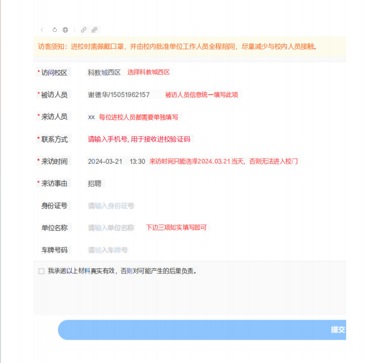 ③信息填写完毕后点击提交,审核通过后将收到预约信息登记成功短信并附带入校链接,入校时请点击链接生成入校二维码并向门卫出示即可。