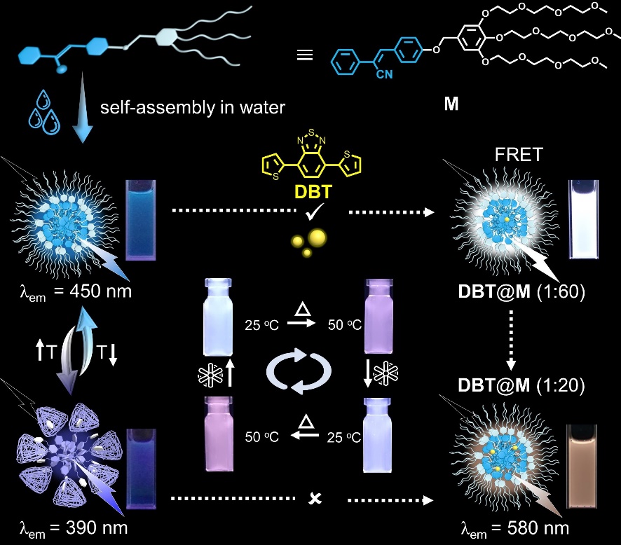在前期的研究中,课题组开发了若干人工超分子光捕获系统(J. Mater. Chem. A2022, 10, 8528-8534. Chem. Commun., 2022, 58, 2343-2346.)和温度响应有机荧光材料(Chem. –Eur. J.2023, 29, e202203463. Chin. Chem. Lett., 2023, 34, 108617.)。在这些工作究的基础上,同时基于自然界光合作用受温度影响的启发,课题组近期在水相中又构筑了一种具有可调白光发射的温度响应型人工光捕获系统,相关工作以“A temperature-responsive artificial light-harvesting system in water with tunable white-light emission”为题发表在国际材料化学权威杂志Journal of Materials Chemistry A上(J. Mater. Chem. A, 2023, 11, 18419-18425. IF: 11.9)。