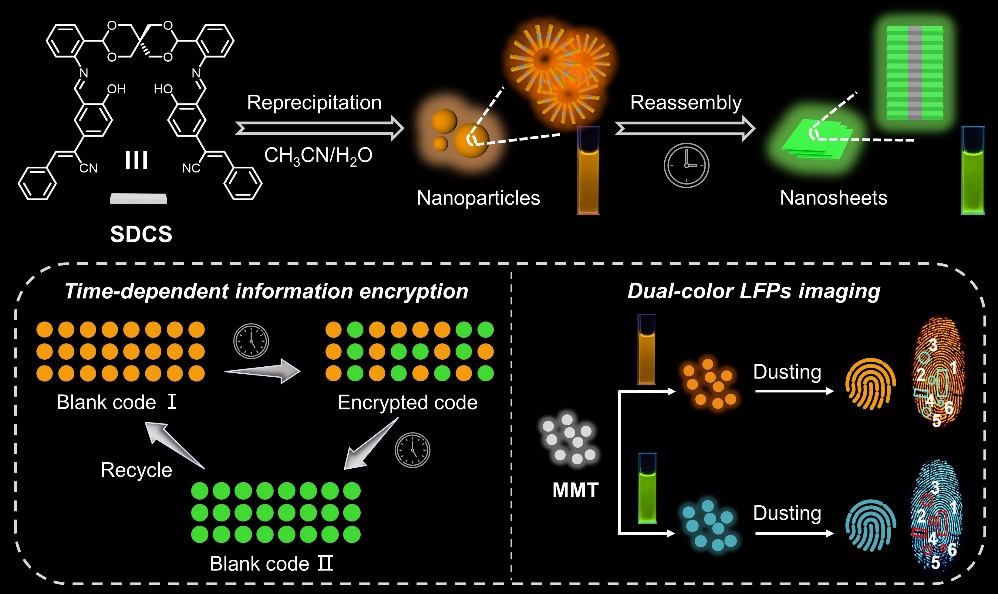 具有随时间变化发光颜色的有机发光材料在化学传感、高分辨率生物成像和高安全性信息加密等领域显示出广阔的应用前景。基于此,研究组开发了一种桥连的氰基苯乙烯衍生物SDCS作为CH3CN/H2O混合溶剂中的单一组分的时间依赖荧光系统。具体来说,通过再沉淀法从SDCS制备的原始橙色发光纳米颗粒可以在超分子自组装的驱动下随着时间的推移转变为绿色发光纳米片。值得注意的是,这种转化速率可以通过调整含水量来控制。基于这些独特的属性,时变荧光二进制码被开发出来,从而实现了具有更高安全性的时间依赖信息加密。此外,SDCS的双色发光可以通过固体基质来独立固定,如被固定在水凝胶或粉末中。其中被固定在蒙脱土中所得的发光粉末成功地用于潜指纹的双色荧光成像。这项工作展示了利用超分子策略控制单组分系统中的多重发射性质并赋予其多功能应用。相关工作以“Dynamic Time-Dependent Emission in Solution and Stable Dual Emission in Solid Matrix Exhibited by a Single-Component Fluorescence System”为题发表在国际材料科学权威杂志Advanced Functional Materials上(Adv. Funct. Mater.2024, doi: 10.1002/adfm.202314093. IF: 19.0)。
