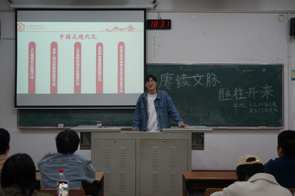 李成旭向同学们介绍了近现代中国现代化进程与历史、改革开放后中国现代化问题的提出,使同学们明确了党的十八大以后中国式现代化的发展目标。张志豪从传统节日、六大建筑派系、传统文化遗产着手,带领同学领略了传统文化的魅力,同时强调了传承传统文化的重要性和必要性。望开元集团的学生通过此次讲座能够结合所学专业,利用所学知识,推动传统文化的传承与创新,坚定文化自信,为中国式现代化的推进作出独属于大学生的特别贡献。