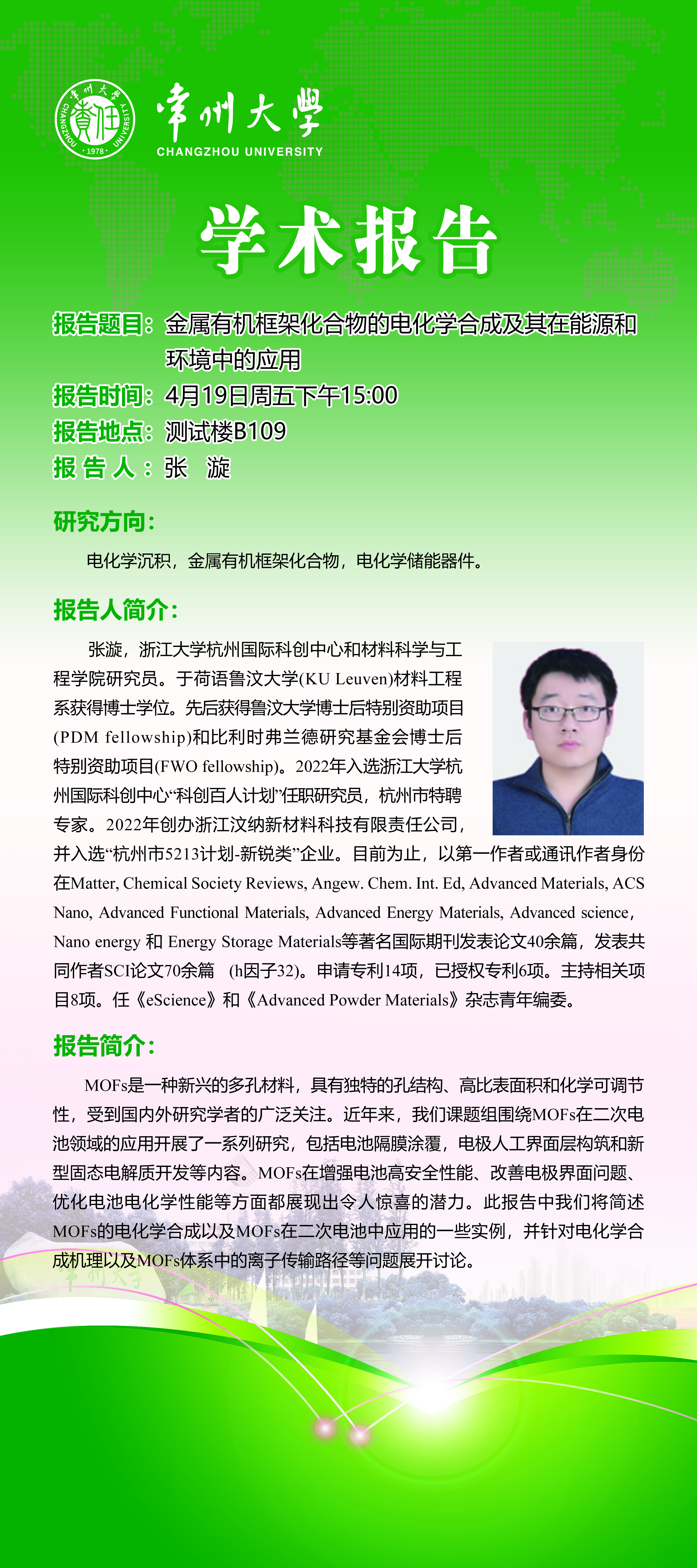 【学术报告】4月19日学术报告 公维佳副教授-西北工业大学 张漩研究员-浙江大学