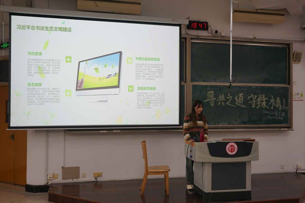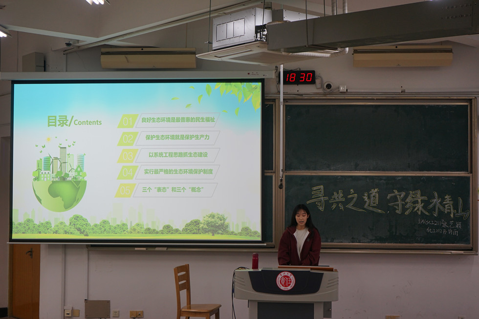 张艺颖介绍了“良好生态环境是最普惠的民生福祉”和“保护生态环境就是保护生产力”两方面内容,旨在强调保护生态环境的重要性;孙诗雨讲述了“系统工程思路抓生态建设”“实行最严格的生态环境保护制度”和“三个表态和三个概念”三方面内容,从保护生态环境的相关措施和思路展开,让学子们意识到国家落实改变生态环境的决心。