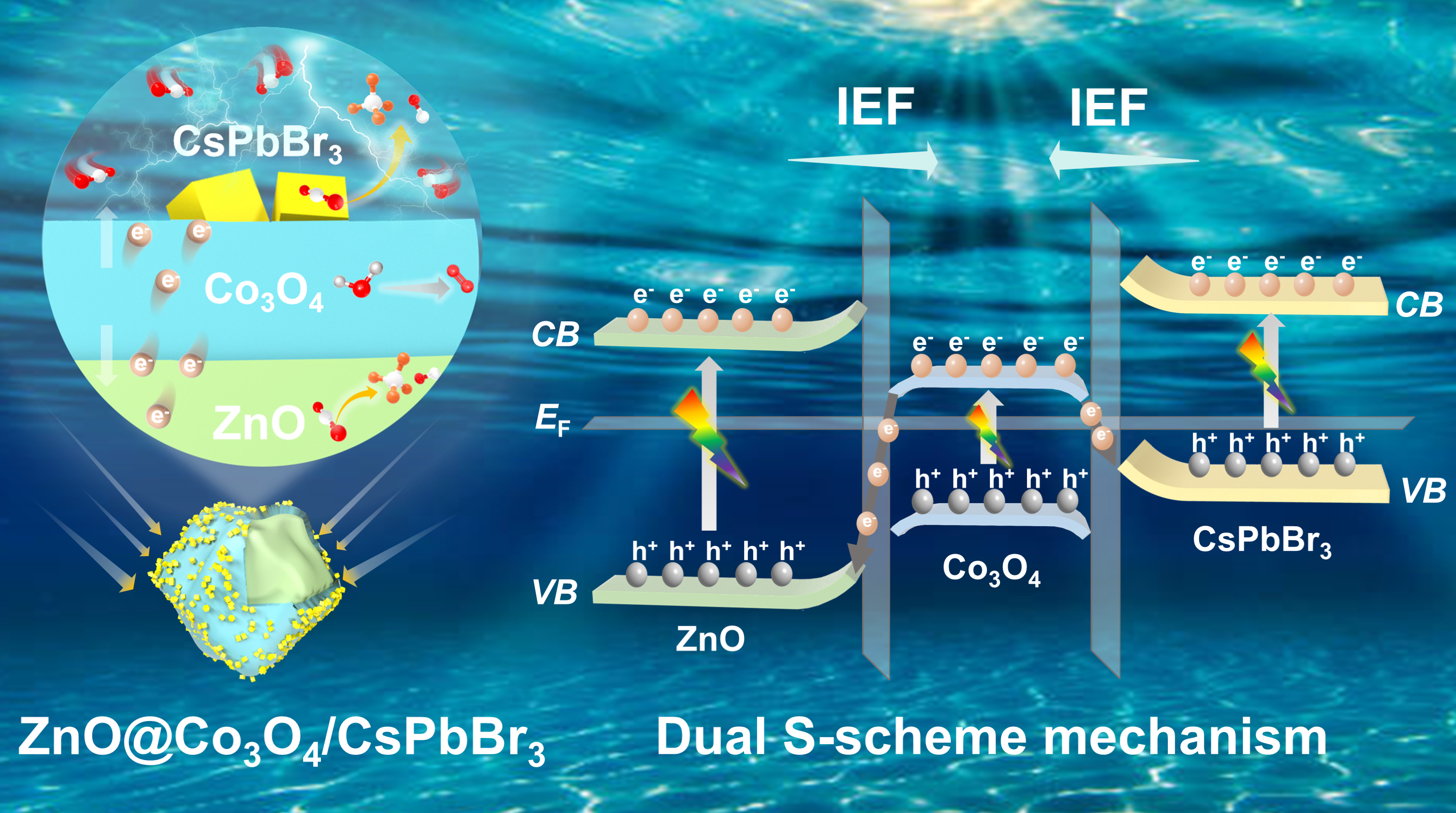 在前期工作基础上(J. Mater. Chem. A, 2022, 10, 24519-24528;Chem. Eng. J. 2023, 475, 146385),同时通过合理设计具有强内建电场和高氧化还原能力的S型异质结的启发,课题组制备MOFs衍生的ZnO@Co3O4/CsPbBr3多壳层催化剂在不使用牺牲剂和光敏剂的情况下,最佳光催化剂CH4产率为238.8 μmol g-1 h-1,选择性高达90.9%。相关工作以:“Internal electric field-modulated dual S-scheme ZnO@Co3O4/CsPbBr3 nanocages for highly active and selective photocatalytic CO2 reduction”为题发表在Journal of Catalysis上 (J. Catal. 2024, 435, 115574, doi:10.1016/j.jcat.2024.115574)