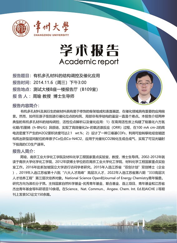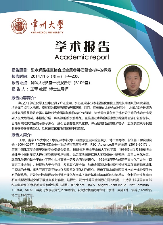 【学术报告】11月6日学术报告—王军教授、周瑜教授 南京工业大学