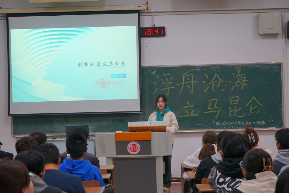 唐晨曦从科技发展的重要性,创新的定义与分类,青年与创新的关系,科技发展的背景与趋势和创新带来的科技进步五个板块进行宣讲,给同学们深度剖析了科技创新与时代发展的关系,展现出科技创新的未来前景。马瑞龙以自己的参赛经历为例,详细地介绍了准备过程和参赛流程,鼓励同学们努力学习,培养创新思维,提高专业知识,积极参加双创竞赛。