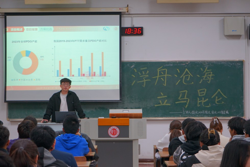 为提升同学们对科技创新及双创竞赛的认知水平,激发他们积极参与的热情,开元集团于11月5日在W1210教室开展了“石化青年说”系列讲座第二讲——浮舟沧海,立马昆仑。本次活动由能化231唐晨曦和能化212马瑞龙主讲,开元集团学生代表参加。
