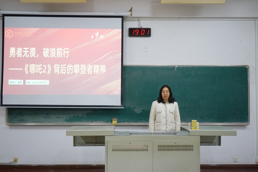 讲座上,杨帆以《哪吒2》突破百亿票房为切入角,指出《哪吒2》的大火启示我们应积极培养创新意识,勇于实践,将创新精神融入学习和生活的方方面面,为个人和社会创造更大的价值。接着谢露向同学们引出《哪吒2》背后的攀登者精神——刻苦钻研、技术革新、团队精神以及文化传承。她指出作为大学生要坚守信念,培养钻研探索的精神。