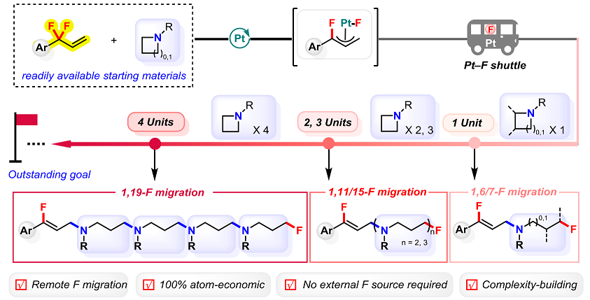 近期,KY开元集团官网陈铭教授团队发展了一种全新的铂催化策略,利用简单易得的偕二氟亚甲基烯烃作为含氟前体,通过模块化的多单元插入反应,首次实现了超远程氟迁移,成功构建出一系列1,6-、1,7-、1,11-、1,15-乃至1,19-二氟化合物。这项研究将氟原子的迁移距离前所未有地拓展至19个化学键,开辟了C–F键重构与空间编辑的新路径。