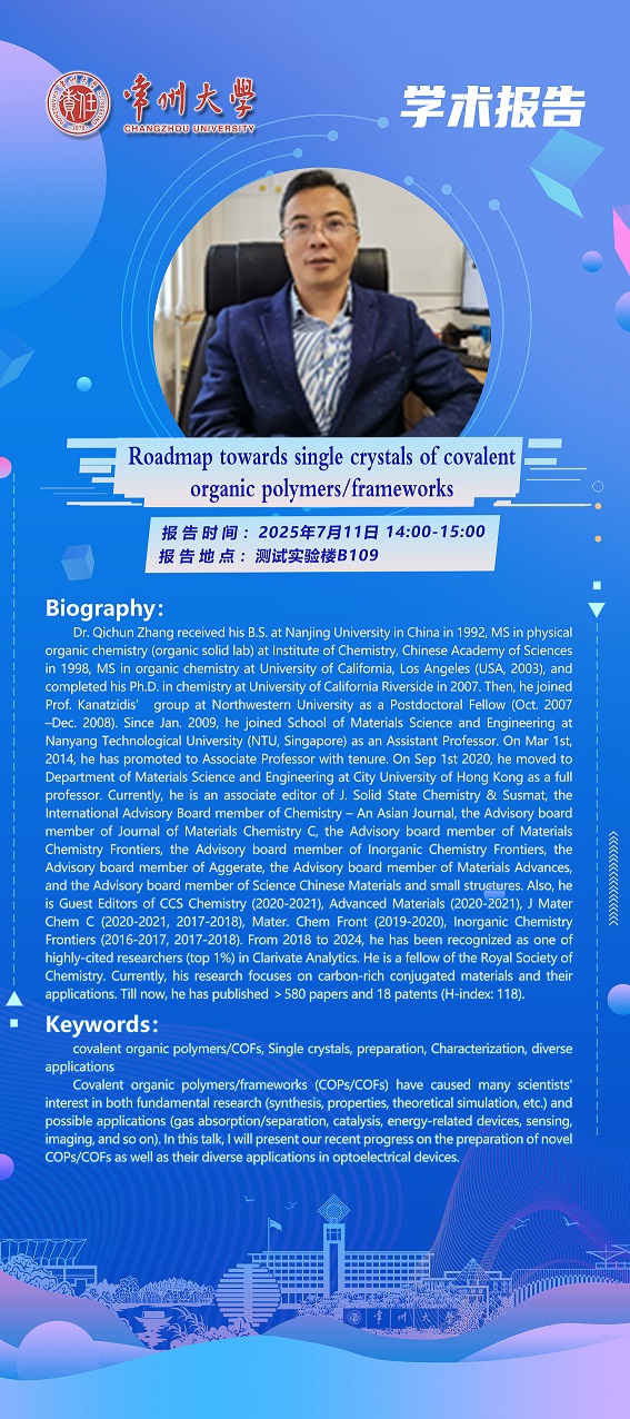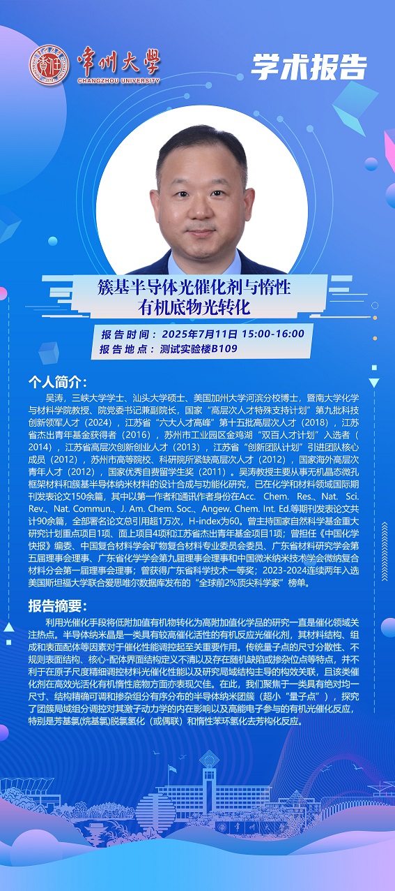 【学术报告】7月11日学术报告——张其春教授 香港城市大学 吴涛教授 暨南大学