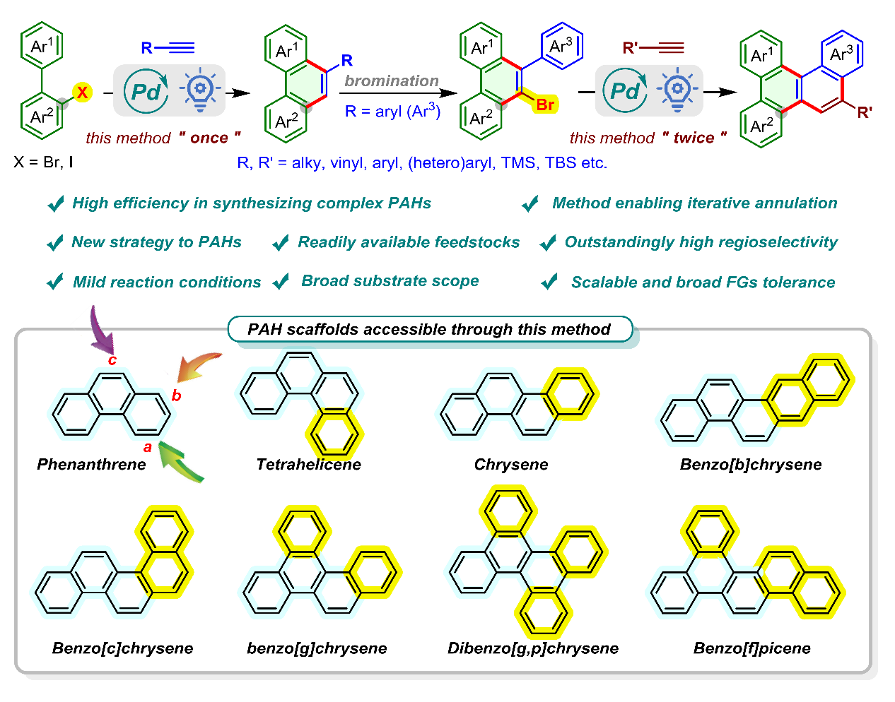 多环芳烃(PAHs)因其独特的π-共轭结构,在有机电子学、光电器件和药物化学中扮演着关键角色。从OLED显示器中的发光材料,到潜在的超导分子,再到天然产物中的活性骨架,PAHs的分子结构直接决定了它们的功能表现。然而,传统合成方法往往依赖高温、多步反应或贵金属催化,不仅效率低、成本高,还常因副反应多而难以精准控制分子结构。尤其当需要构建复杂、扩展型PAH骨架时,化学家们面临“步骤多、产率低、选择性差”的三重困境。因此,开发一种步骤简洁、条件温和、可模块化拓展的新策略,成为材料化学与合成化学共同亟待突破的科学问题。