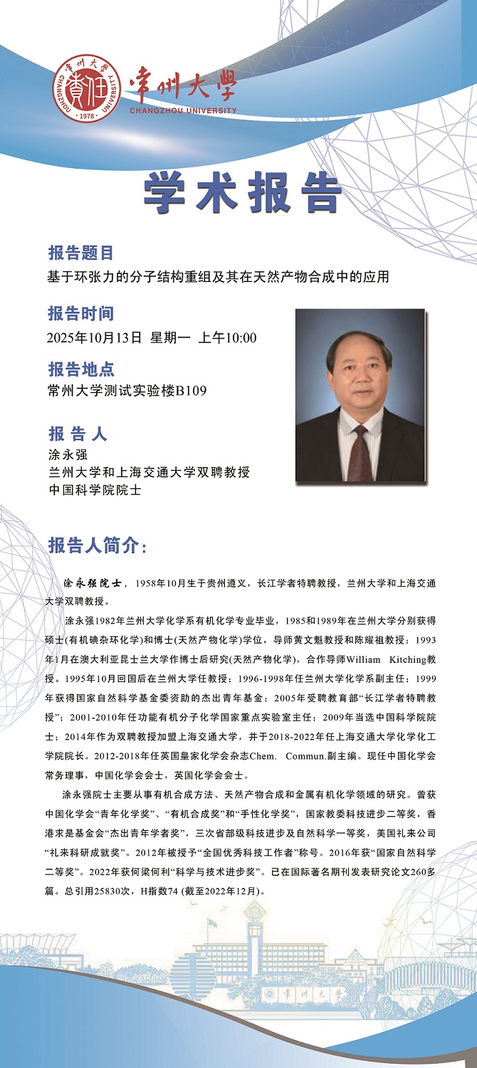 【学术报告】10月13日自然与合成有机化学研究院学术报告——涂永强院士 上海交通大学