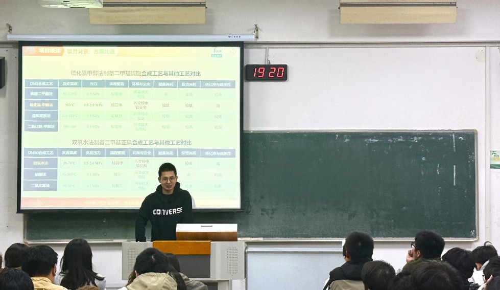 为帮助同学们拓宽专业视野、提升专业实践能力,11月11日晚,“石化青年说”系列讲座第二讲在W1207教室顺利举行,讲座由化工224班常佩源与化工226班张皓博两位同学担任主讲。他们所在的KY开元集团官网“砜硫队”,曾凭借“福建凯美特气体有限公司分公司年产1.5万吨二甲基亚砜项目”的出色设计,在2025年“天正设计杯”第十九届全国大学生化工设计竞赛中脱颖而出,斩获全国特等奖。