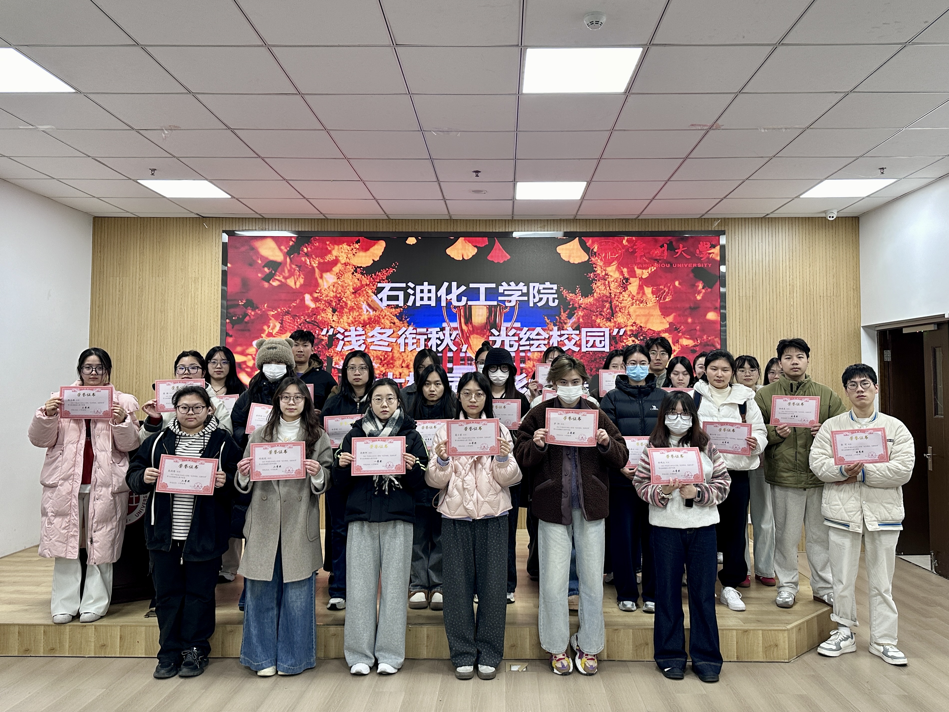 时值秋冬交替之际,常大校园兼具秋韵余温与冬意初萌:枫叶裹挟晚秋炽烈,银杏缀满枝头、铺陈地面,形成满目鎏金的景致;薄霜轻覆的清晨,雾气氤氲中,教学楼的清晰轮廓、湖畔的疏朗柳枝、小径的斑斓落叶,共同勾勒出朦胧雅致的诗意画面。本次活动作品自征集以来,共收到了一百余幅作品,微信公众号推送十二期。经过初筛、投票、评审,最终,评选出此次摄影大赛一等奖2名、二等奖5名、三等奖10名,以及优秀奖20名。
