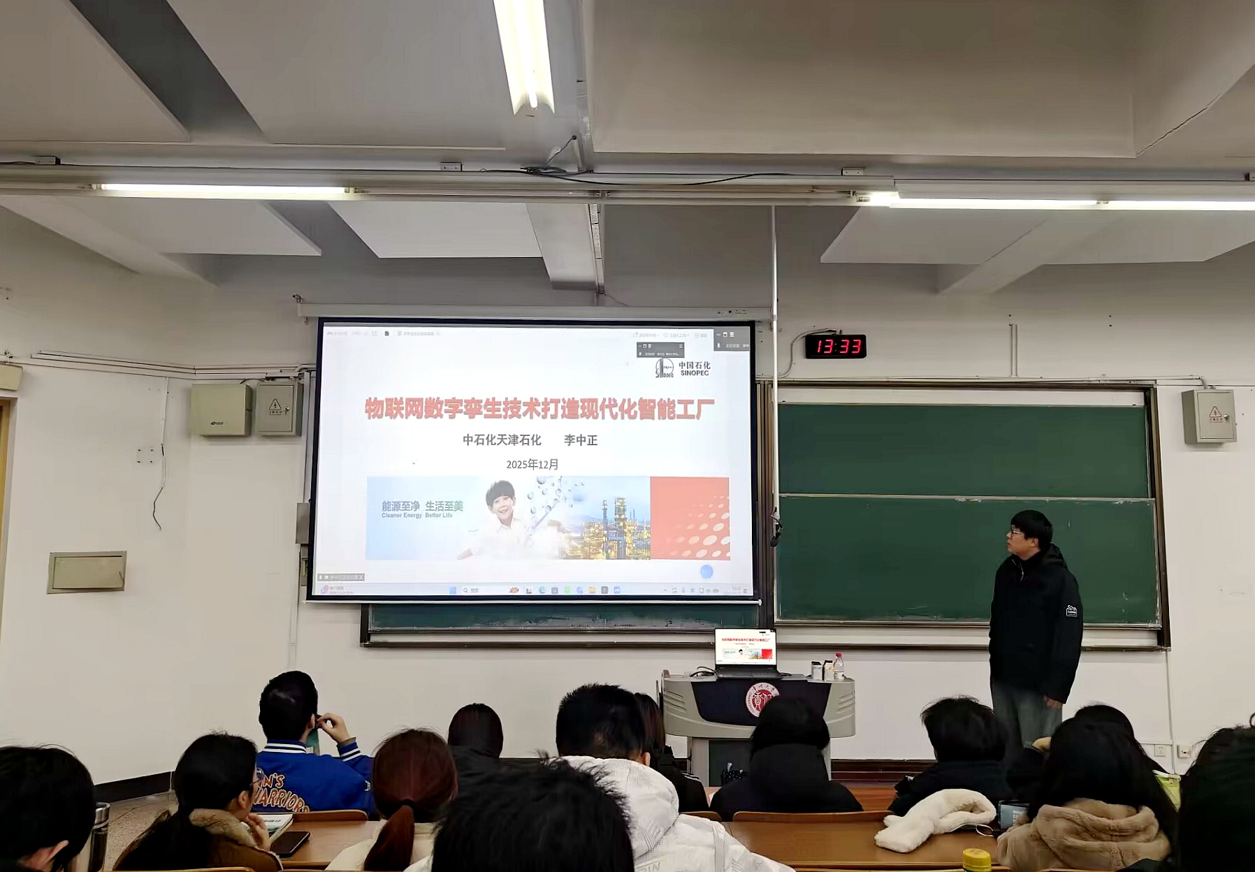 12月12日,化工数字技术课程邀请天津石化专家李中正工程师走进课堂,为师生作了题为“物联网数字孪生技术打造现代化智能工厂”的专题授课。