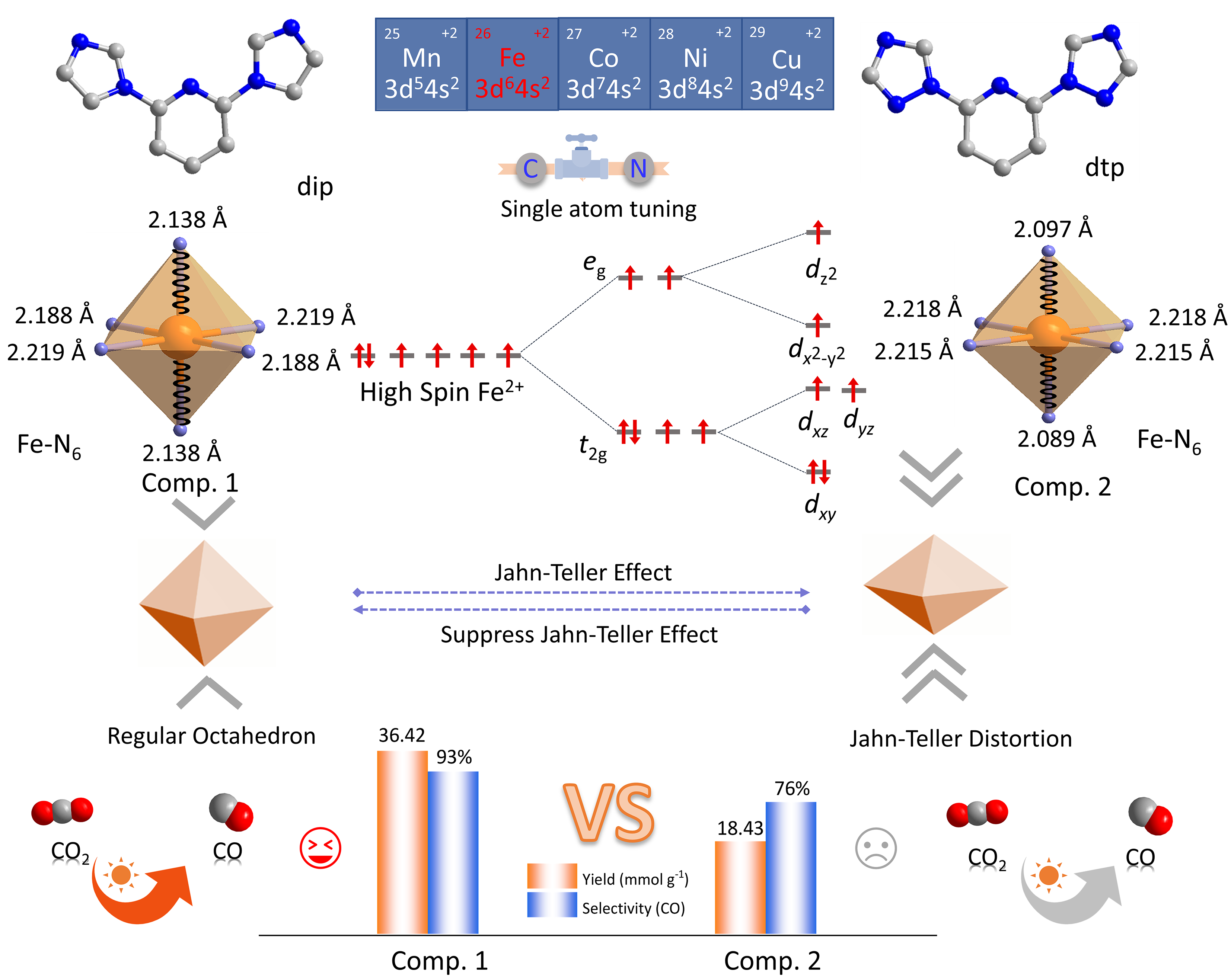 针对如何在原子层次精准调控催化活性中心的电子结构,该研究提出了一种通过单原子修饰调控Jahn-Teller效应,进而优化Fe活性位点电荷密度的新策略(图1)。研究团队通过自组装方法,使用相同铁前驱体但不同含氮配体(dip vs. dtp),成功合成了两种分别具有弱Jahn-Teller效应(化合物1)和显著Jahn-Teller效应(化合物2)的金属‒有机纳米材料。在可见光下,化合物1的CO产率几乎是化合物2的两倍。单晶X射线衍射、XPS、磁化率、原位DRIFTS等实验分析以及DFT计算共同表明,Jahn-Teller效应的弱化显著增强了Fe活性位点的电荷密度,从而促进了CO2的吸附与活化,最终提升了CO的生成。