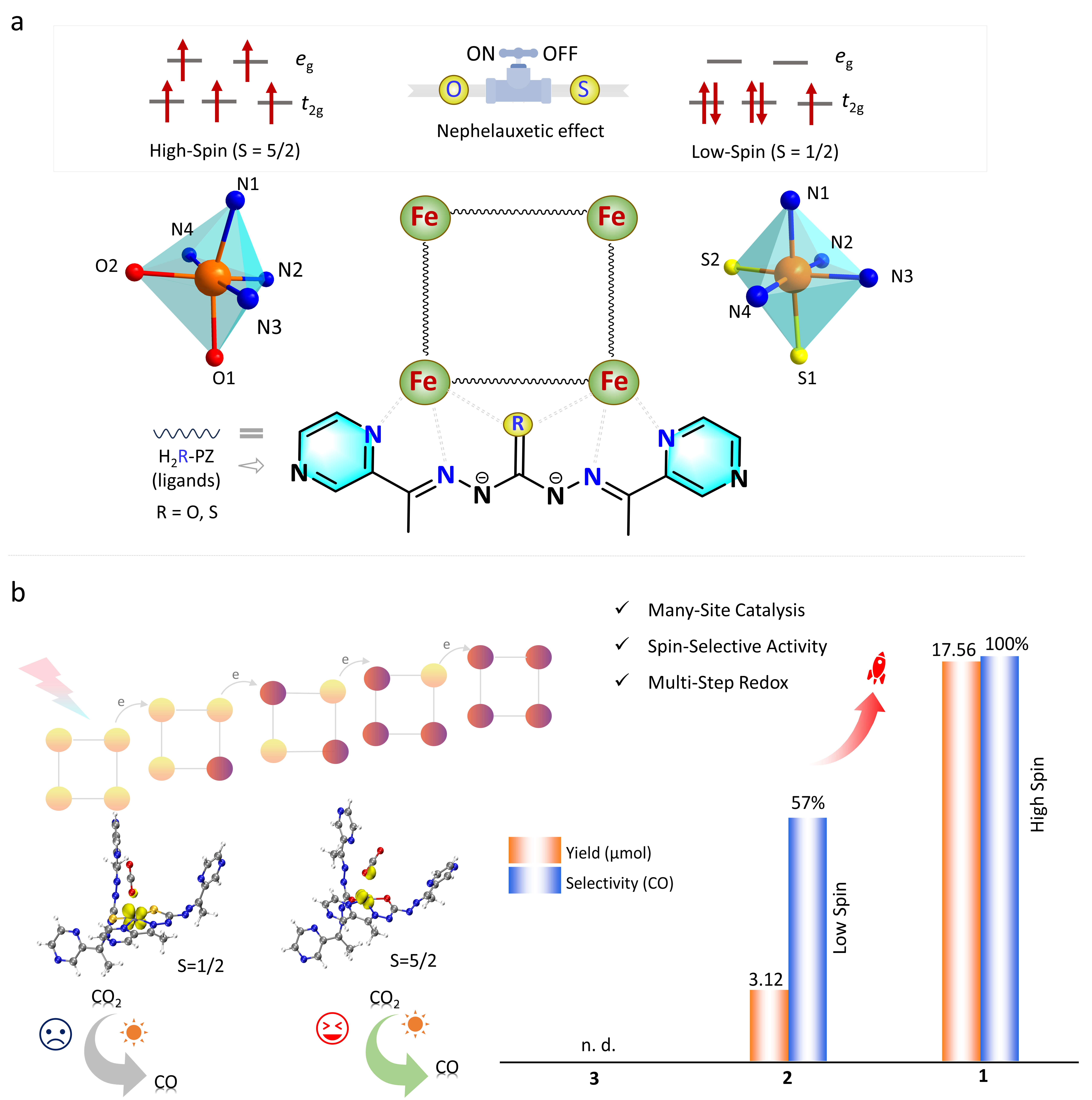 课题组针对催化中心自旋态在原子尺度上的精准调控难题,提出了一种超分子自组装新策略:通过构建基于π‒π堆积的长程有序结构,并巧妙利用配体的Nephelauxetic 效应,仅通过替换单个桥原子即实现了Fe3+中心在高自旋与低自旋态之间的可控切换,成功制备了自旋态可调的Fe4团簇超薄纳米层(图2)。研究表明,高自旋态Fe3+团簇具有更优异的电子转移能力,可显著促进光生载流子分离与传输,在CO2还原反应中表现出接近100%的CO选择性及远优于低自旋体系的催化活性。理论计算进一步阐明,高自旋态Fe3+与CO2之间存在更强的轨道相互作用,不仅能增强CO2吸附,还可降低关键中间体形成的吉布斯自由能。该工作不仅为设计具有自旋调控功能的CO2光还原催化剂提供了新颖的超结构模型,也深化了对自旋态影响人工光合作用过程机制的认识。