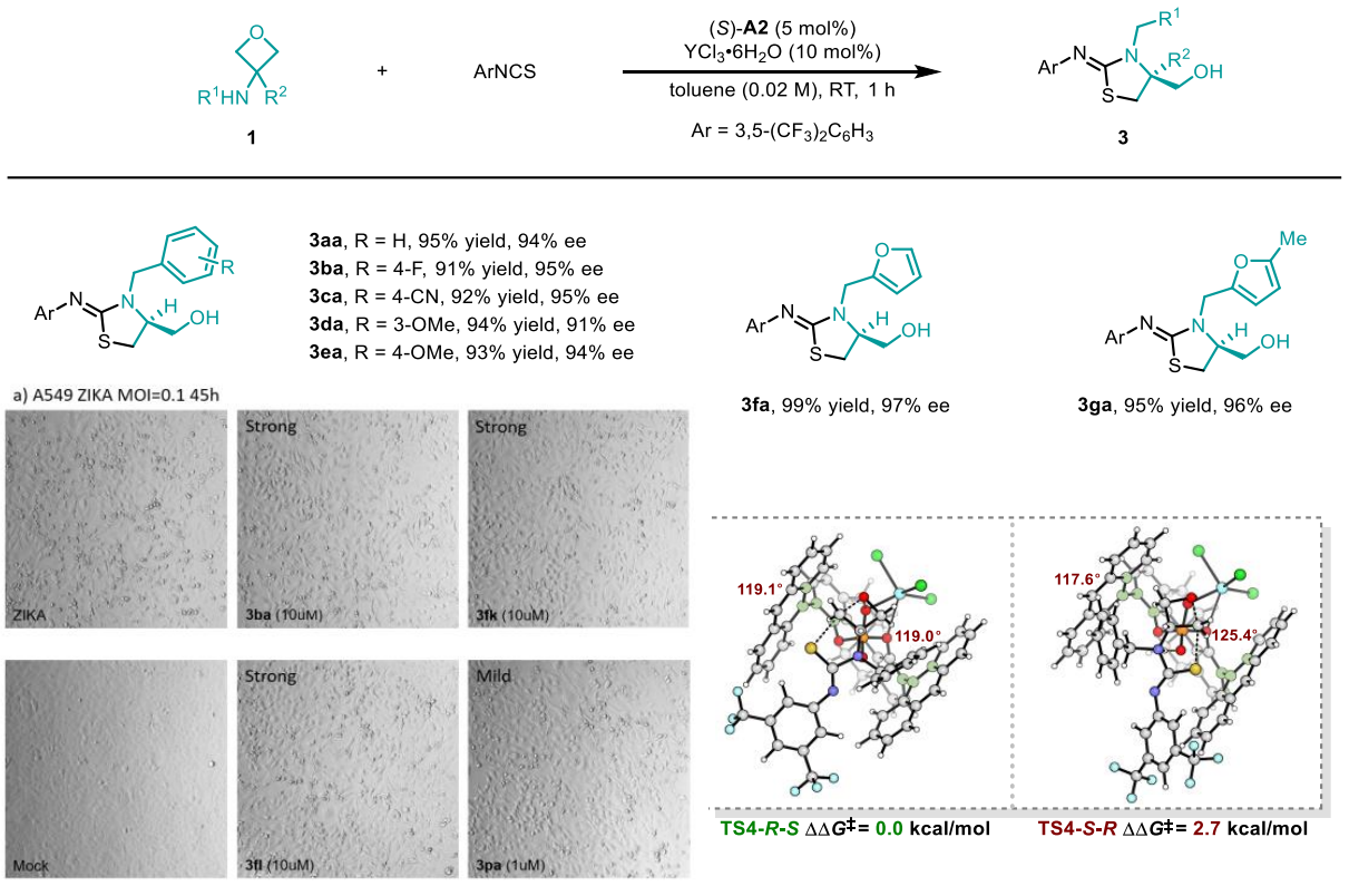 近日,KY开元集团官网孙建伟、黄海、韩政宇等人报道了一种用于3-氨基氧杂环丁烷与异硫氰酸酯对映选择性环化构建手性2-亚氨基噻唑烷的二元催化体系。该工作采用手性磷酸与路易斯酸组成的二元催化体系,在温和条件一步构建了具有多个可调取代基的手性2-亚氨基噻唑烷骨架。作者通过对照实验、中间体捕获尝试以及DFT计算系统阐明了反应机理,揭示手性磷酸负责活化氧杂环丁烷进行分子内SN2开环,而路易斯酸并不直接活化底物,而是通过增强手性磷酸的酸性和刚性来提升其催化性能,其中过渡态中N–H···O–P氢键的稳定作用及催化剂构象的不利扭曲是决定对映选择性的关键因素。该研究进一步发现所得手性产物对寨卡病毒(ZIKV)具有显著抑制活性,在低细胞毒性下可使病毒RNA水平降低80%以上,凸显了该类化合物作为新型抗病毒先导结构的巨大潜力,为抗病毒药物研发提供了新的化学空间。