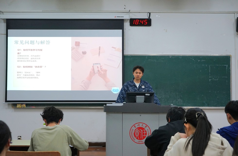 会上,两位同学结合个人经历,围绕志愿精神内涵、个人服务经历、能力提升指南及未来展望展开分享。王梓豪为同学们分享了几段个人志愿服务经历,鼓励同学们主动参与志愿实践,在服务中迎难而上、收获成长。宋羽凡则补充选择项目应结合兴趣、专业与课余时间,通过正规渠道参与,平衡好学业与服务。